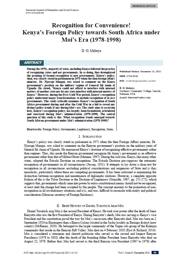During the 1970s, majority of states, including Kenya followed the practice of recognizing states and not governments. In so doing, they downplayed the granting of formal recognition to new governments. Kenya’s policy, then, was clearly stated in parliament in 1971 when the then foreign affairs minister, Dr. Njoroge Mungai, was asked to comment on the Kenya government’s position on the military regime of General Idi Amin of Uganda. He stated, “Kenya could not afford to interfere with internal matters of another state nor let any state interfere with internal matters of Kenya.” However, during the Post–Cold War period, Kenya’s recognition policy underwent major transformations to include recognition of de jure governments. This study critically examines Kenya’s recognition of South Africa government during and after the Cold War in a bid to reveal any distinct policy trends if any during Moi’s era. The study aims to ascertain how, Kenya’s recognition policy, has largely, been formulated, articulated and exercised during Moi’s administration (1978-1998). The central question of this study is this: What recognition trends emerged towards South African government under Moi’s administration (1978-1990)?