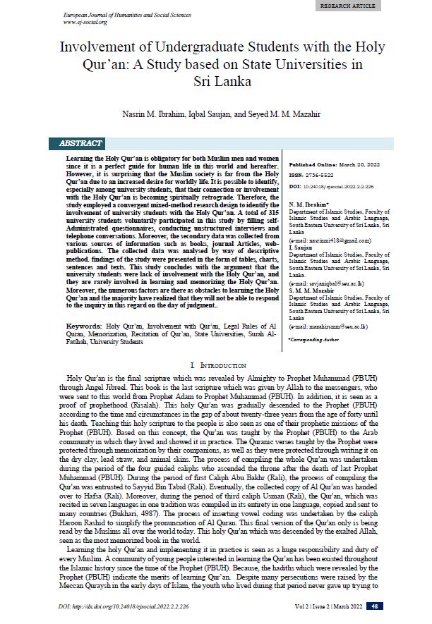 Learning the Holy Qur’an is obligatory for both Muslim men and women since it is a perfect guide for human life in this world and hereafter. However, it is surprising that the Muslim society is far from the Holy Qur’an due to an increased desire for worldly life. It is possible to identify, especially among university students, that their connection or involvement with the Holy Qur’an is becoming spiritually retrograde. Therefore, the study employed a convergent mixed-method research design to identify the involvement of university students with the Holy Qur’an. A total of 315 university students voluntarily participated in this study by filling self-Administrated questionnaires, conducting unstructured interviews and telephone conversations. Moreover, the secondary data was collected from various sources of information such as books, journal Articles, web-publications. The collected data was analysed by way of descriptive method. findings of the study were presented in the form of tables, charts, sentences and texts. This study concludes with the argument that the university students were lack of involvement with the Holy Qur’an, and they are rarely involved in learning and memorizing the Holy Qur’an. Moreover, the numerous factors are there as obstacles to learning the Holy Qur’an and the majority have realized that they will not be able to respond to the inquiry in this regard on the day of judgment.
