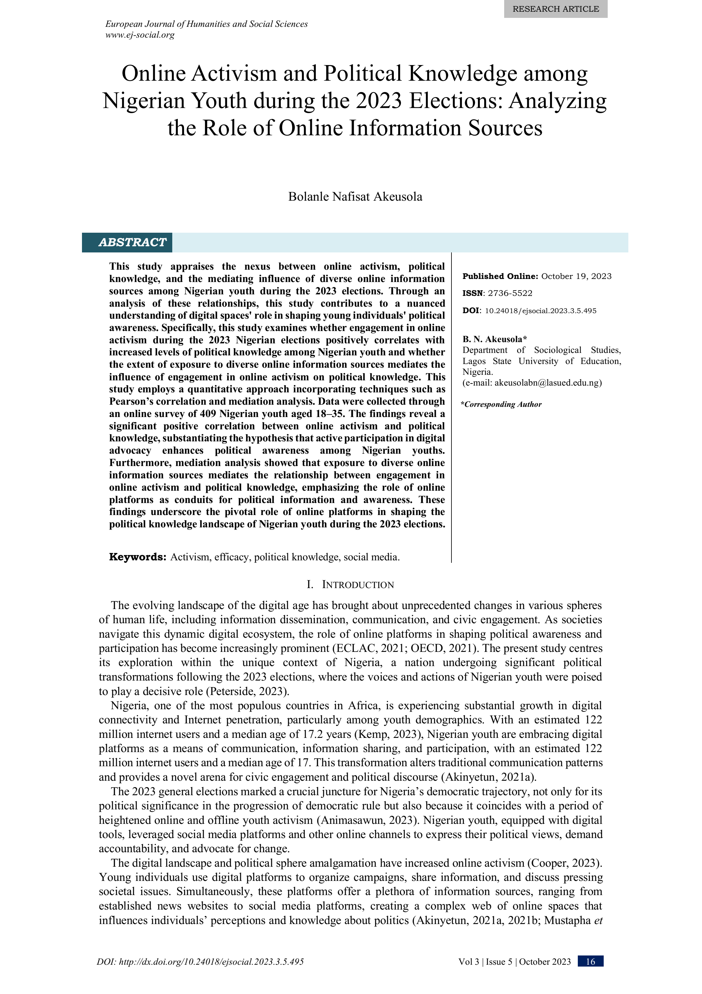 Online Activism and Political Knowledge among Nigerian Youth during the 2023 Elections: Analyzing the Role of Online Information Sources