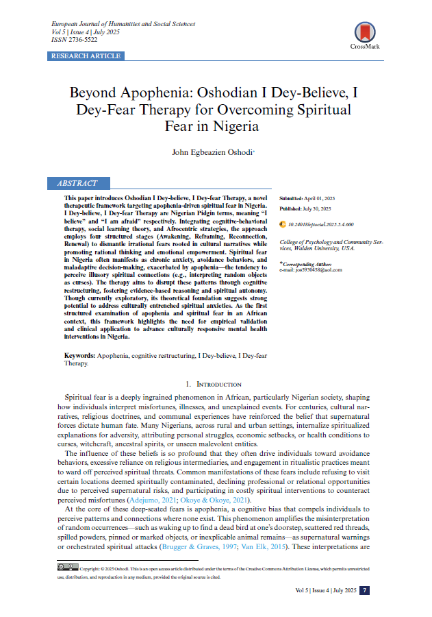 Beyond Apophenia: Oshodian I Dey-Believe, I Dey-Fear Therapy for Overcoming Spiritual Fear in Nigeria