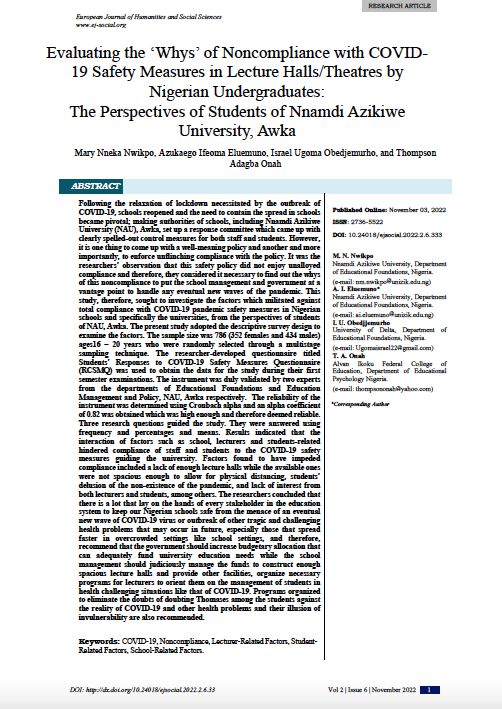 Evaluating the ‘Whys’ of Noncompliance with COVID- 19 Safety Measures in Lecture Halls/Theatres by Nigerian Undergraduates: The Perspectives of Students of Nnamdi Azikiwe University, Awka
