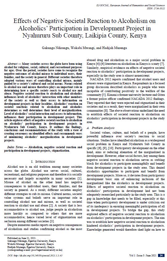Effects of Negative Societal Reaction to Alcoholism on Alcoholics’ Participation in Development Project in Nyahururu Sub County, Laikipia County, Kenya