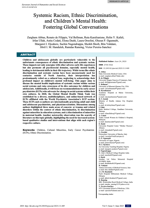 Systemic Racism, Ethnic Discrimination, and Children’s Mental Health: Fostering Global Conversations