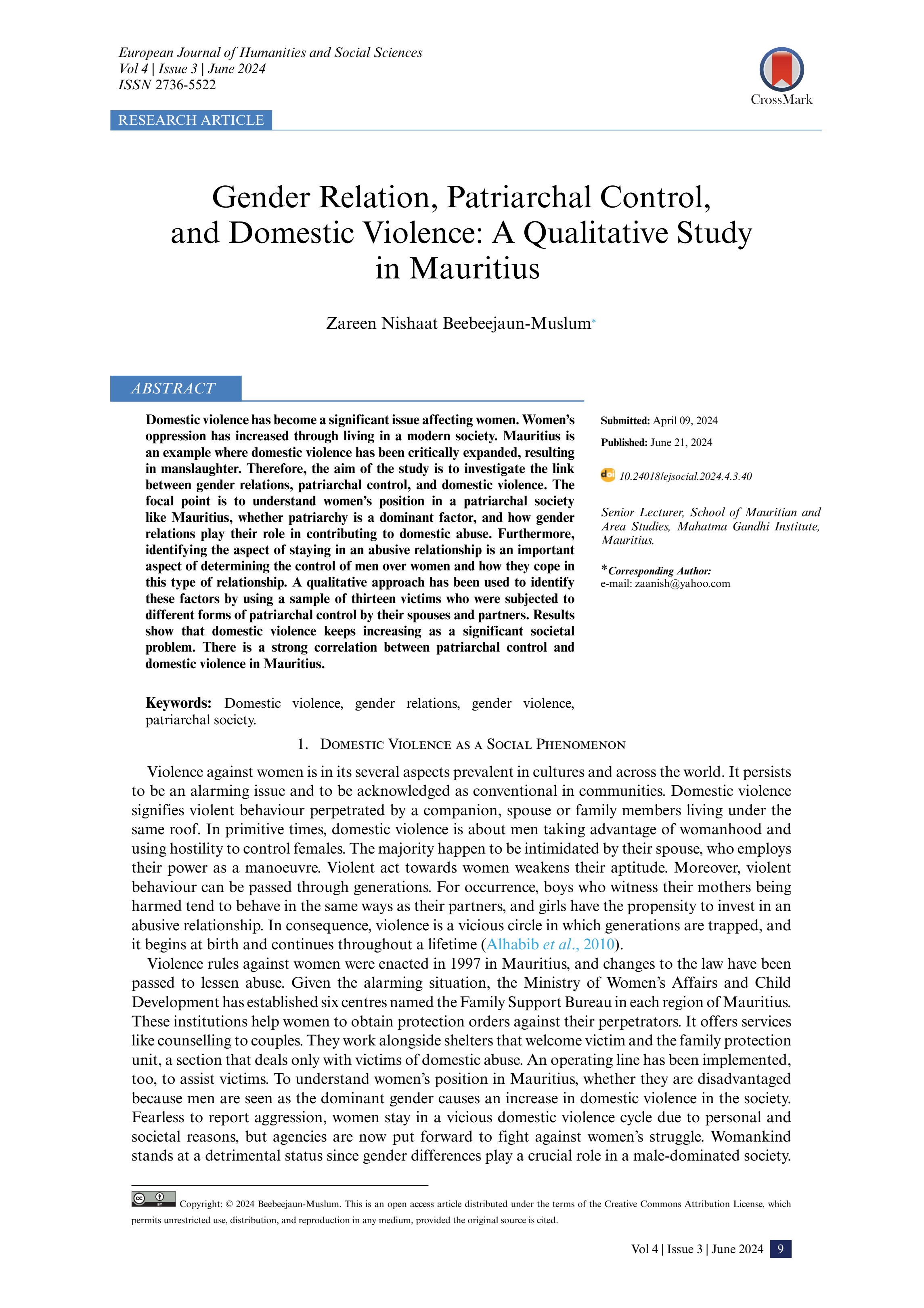 Gender Relation, Patriarchal Control, and Domestic Violence: A Qualitative Study in Mauritius