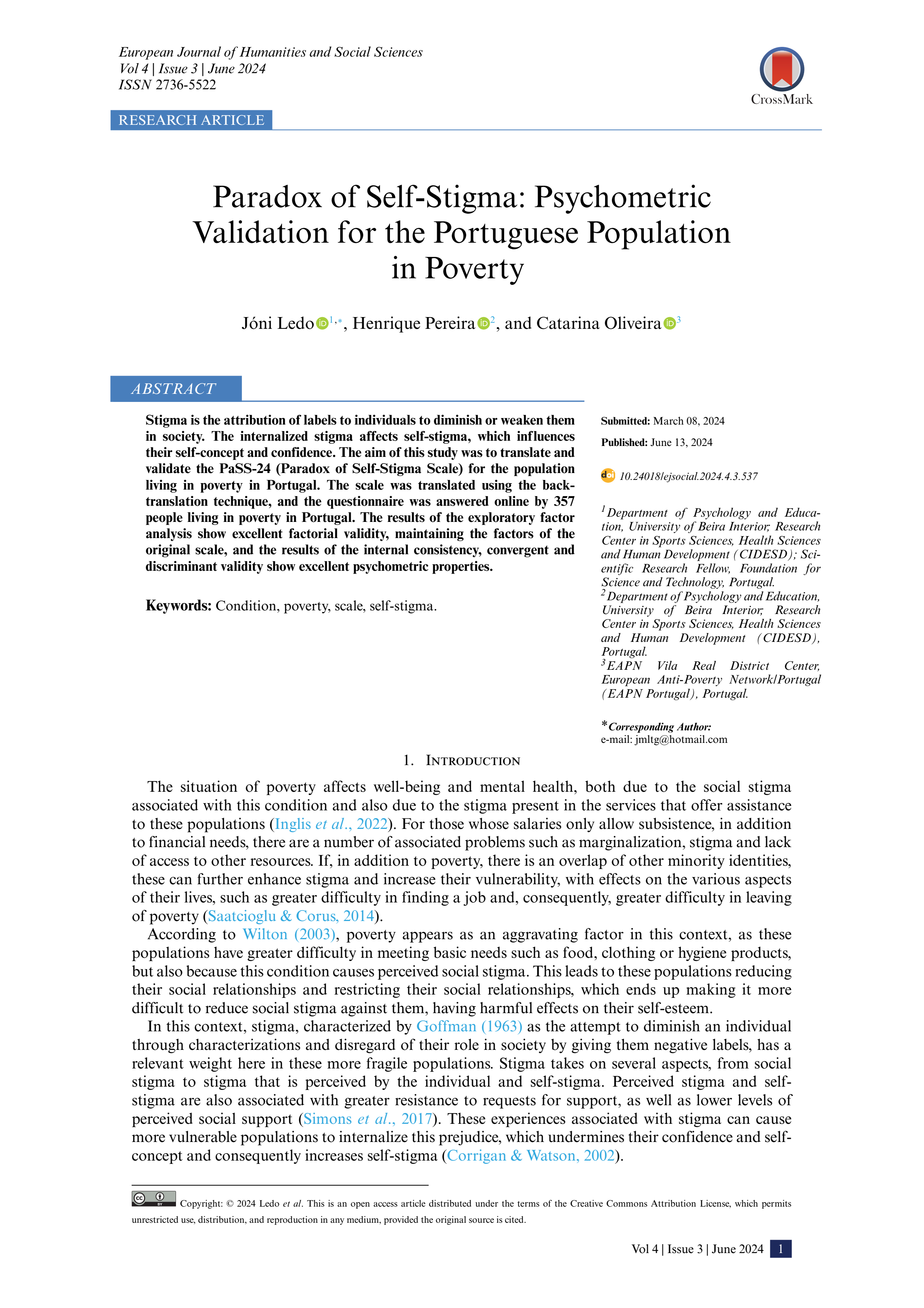 Paradox of Self-Stigma: Psychometric Validation for the Portuguese Population in Poverty
