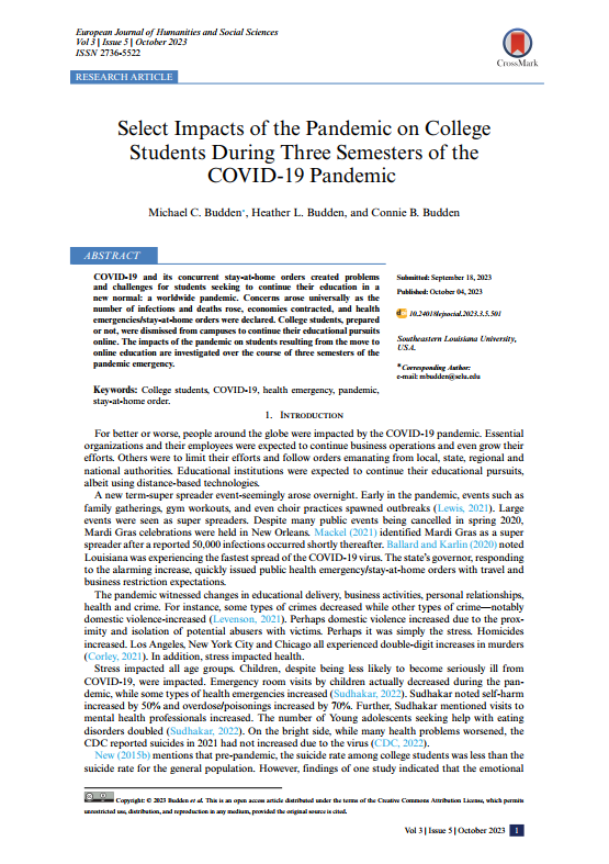 Select Impacts of the Pandemic on College Students During Three Semesters of the Covid-19 Pandemic