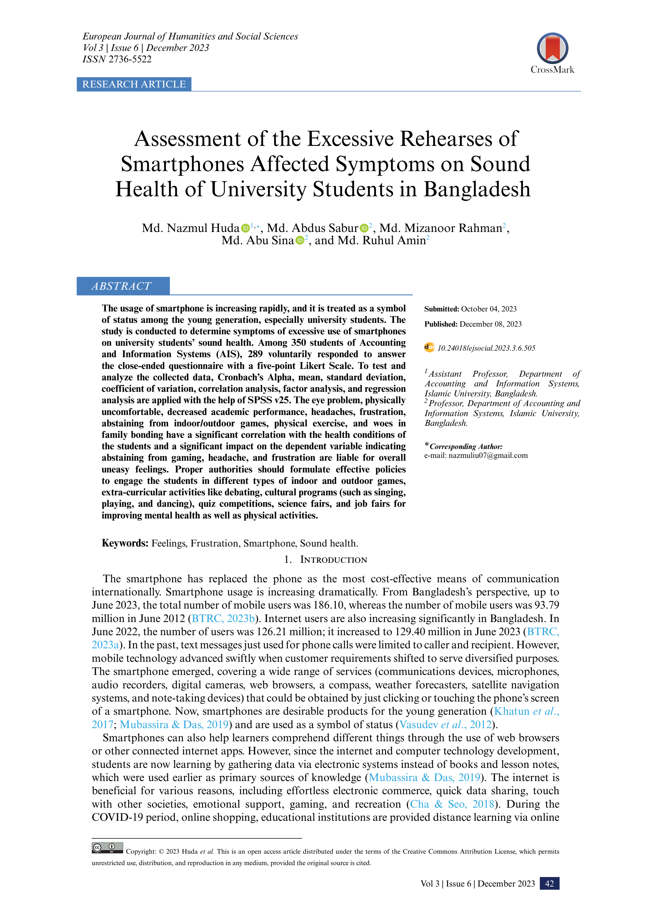 Assessment of the Excessive Rehearses of Smartphones Affected Symptoms on Sound Health of University Students in Bangladesh