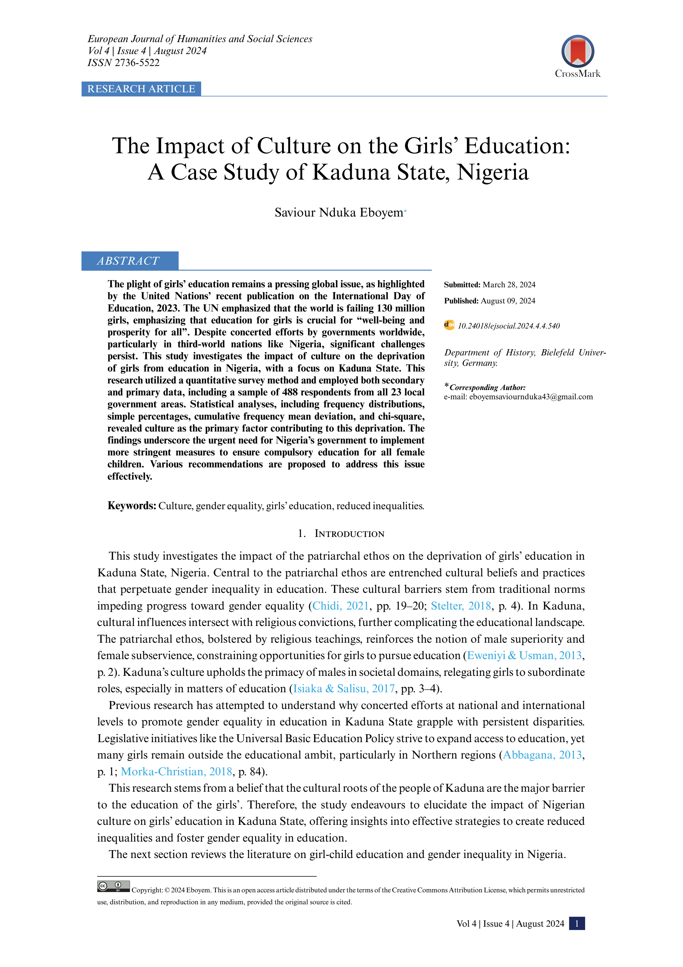 The Impact of Culture on the Girls’ Education: A Case Study of Kaduna State, Nigeria