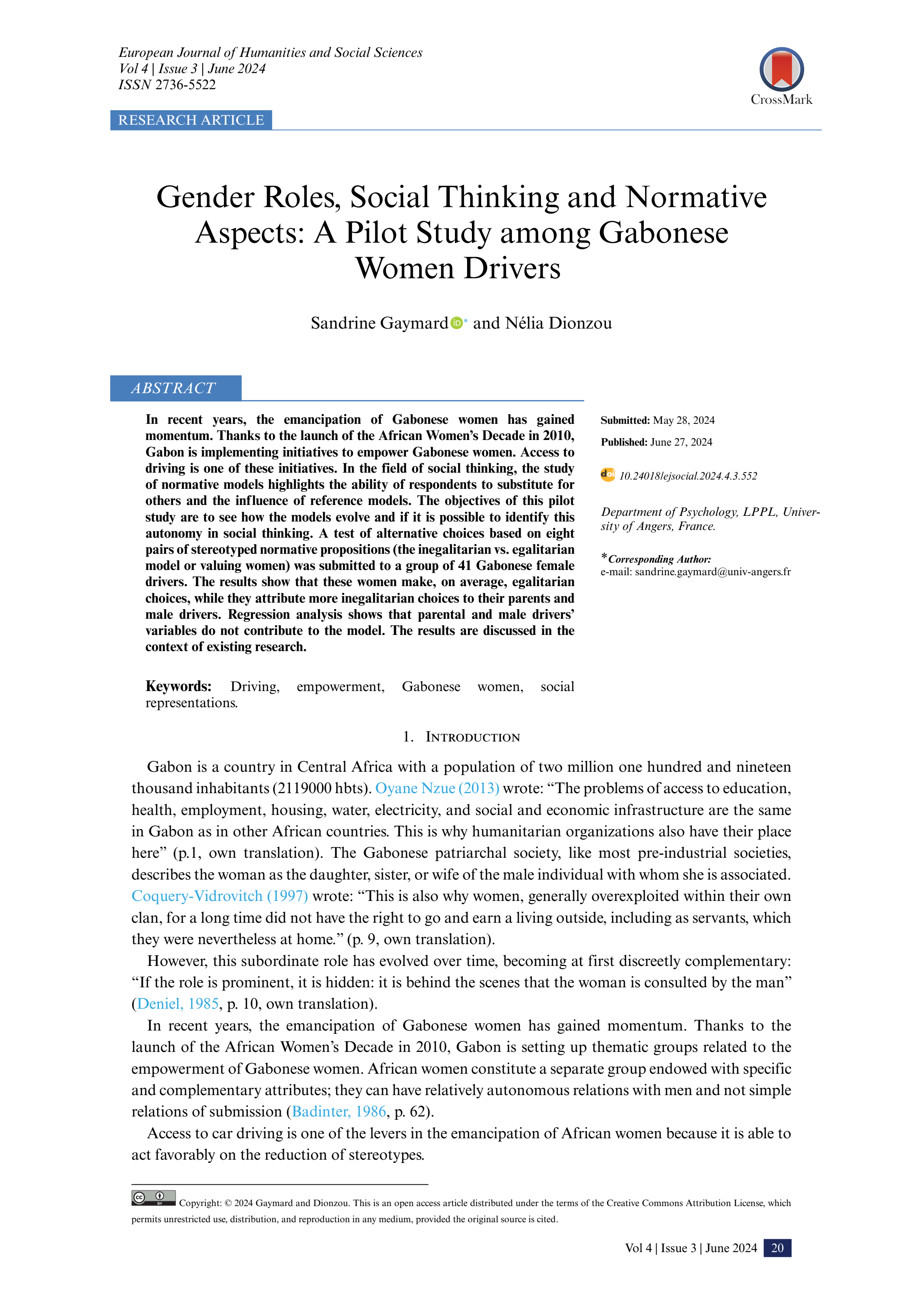 Gender Roles, Social Thinking and Normative Aspects: A Pilot Study among Gabonese Women Drivers