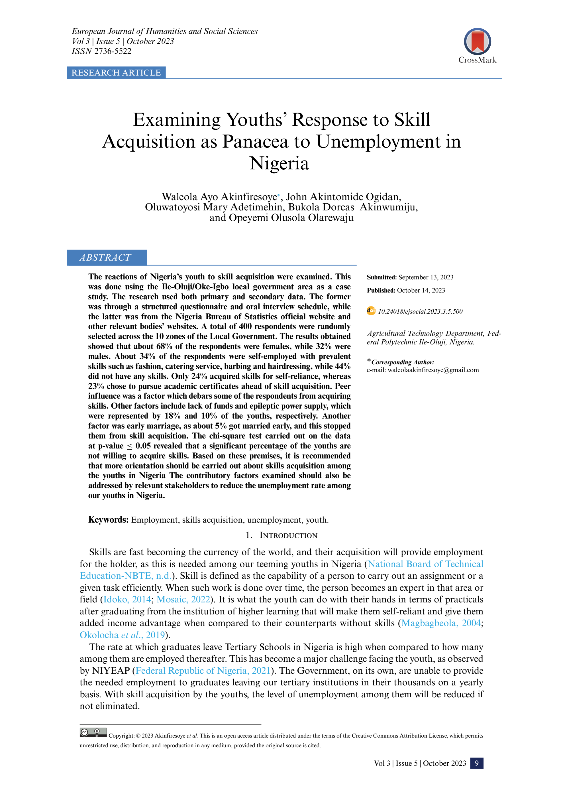 Examining Youths’ Response to Skill Acquisition as Panacea to Unemployment in Nigeria